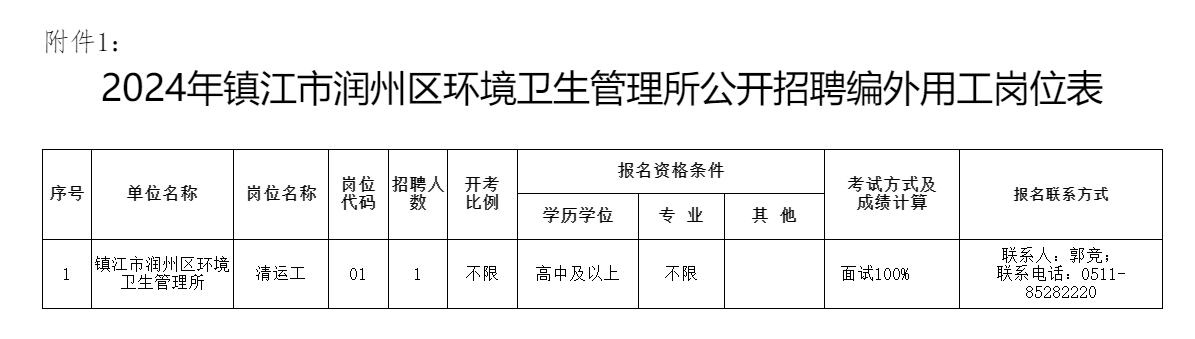 附件1:2024年镇江市润州区环境卫生管理所公开招聘编外用工岗位表
